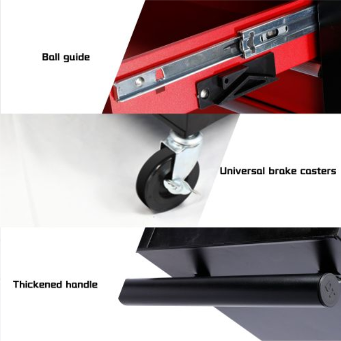 - The drawer slider of the tool cart is equipped with smooth ball bearing sliders in a quiet working environment, ensuring smooth and noise free drawer switching. The wheels of the tool cart have shock-absorbing and silent design, ensuring a quiet working environment for you when the tool cabinet is moving and working.